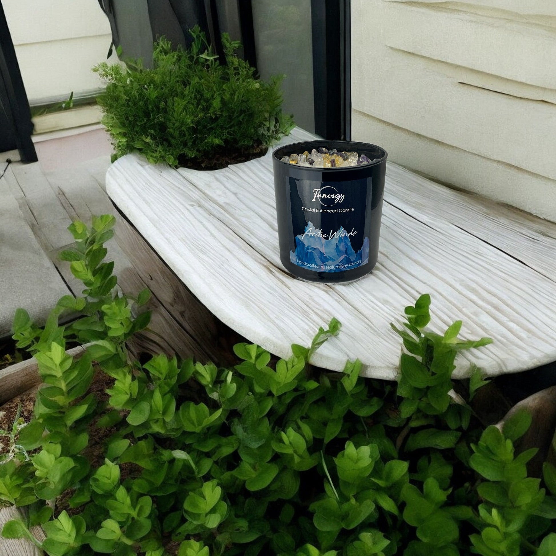 Experience the invigorating embrace of our Arctic Winds Crystal Candle, a creation that captures the essence of boldness and adventure. This candle is infused with the exhilarating "Arctic Winds" scent, a robust blend that combines the crispness of eucalyptus, the clarity of rosemary, the grounding essence of cedar, and a calming hint of lavender. This fragrance is designed to energize and inspire, reflecting the spirit of courage and determination.