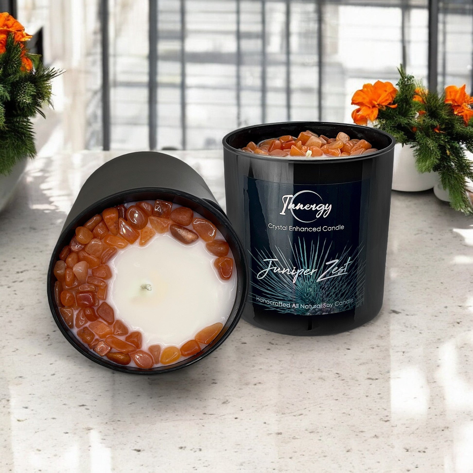 Elevate your energy with the serene ambiance of our Juniper Zest Crystal Candle, featuring the enchanting harmonious blends of the sharp, botanical freshness of juniper with the soft elegance of geranium, black currant, and a hint of peppermint, creating a scent that is both tart and sweet.