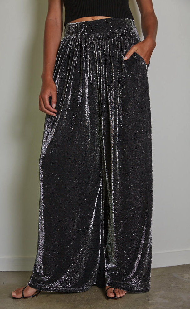 Elevate your everyday style with our Knit Lurex Wide Leg Pants. These stunning shimmering pants feature a touch of metallic sparkle, a comfortable elastic waistband, and practical side pockets. The blend of nylon, polyester, and lurex creates a soft, breathable fabric with a subtle sheen, perfect for day or night. The wide-leg silhouette adds a flowy, flattering touch, while the polyester spandex lining ensures a comfortable and smooth fit.
