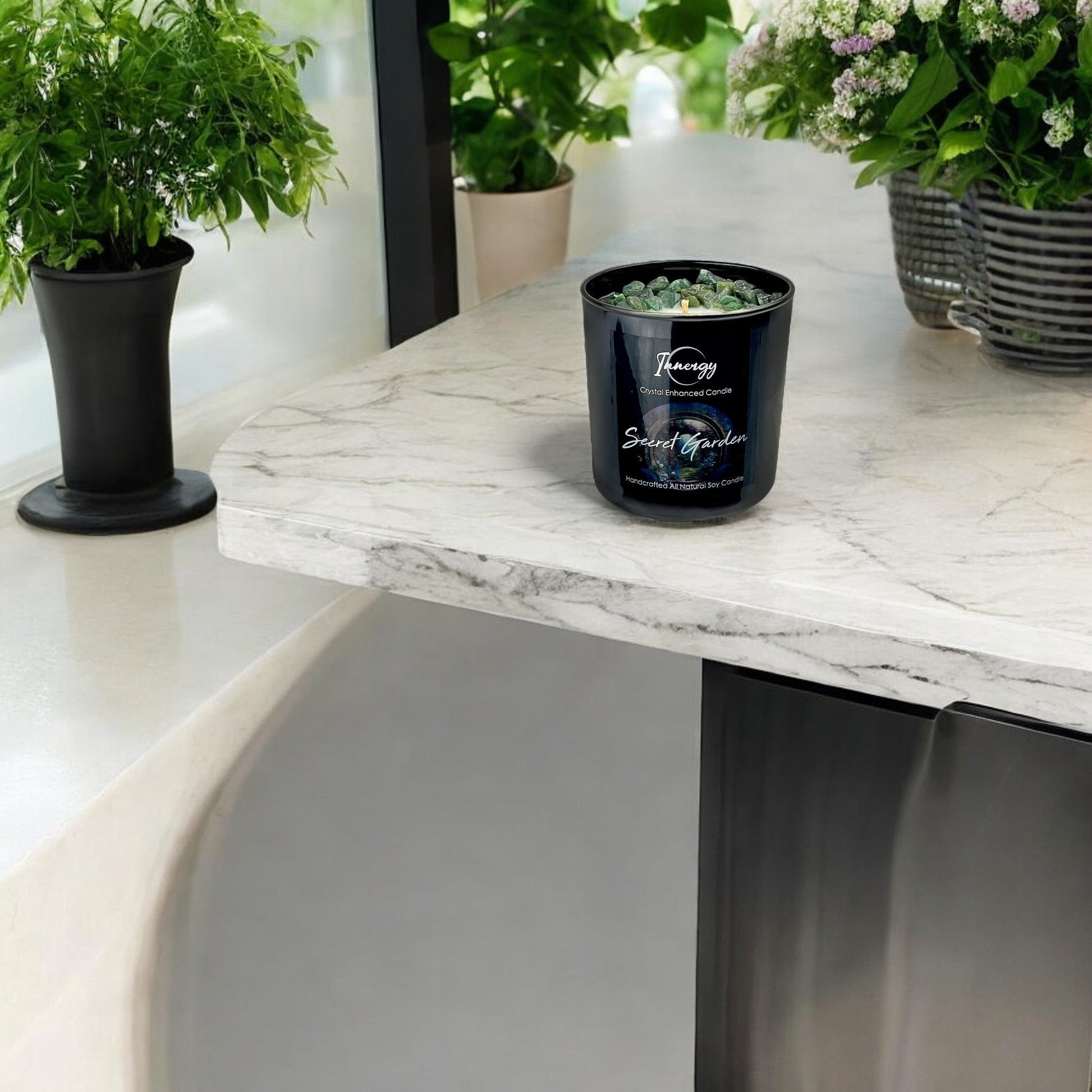 Nurture your senses with the Enchanting Secret Garden Crystal Candle. Immerse yourself in our "Secret Garden" scent, a captivating blend of aromatic herbs, warm amber, and delicate florals, designed to elevate your sensory experience.